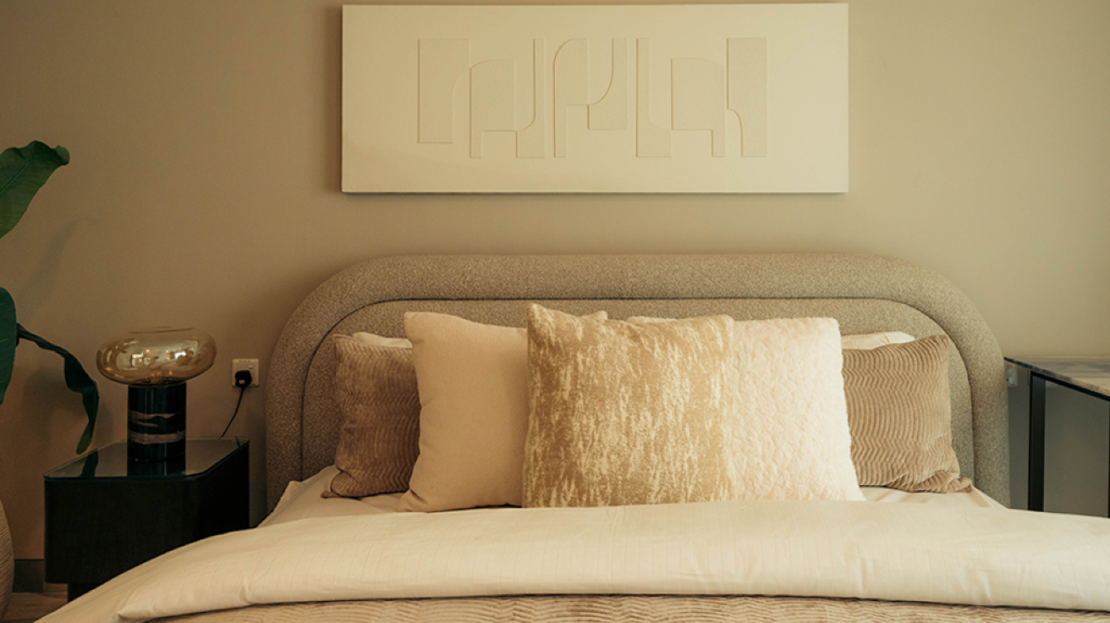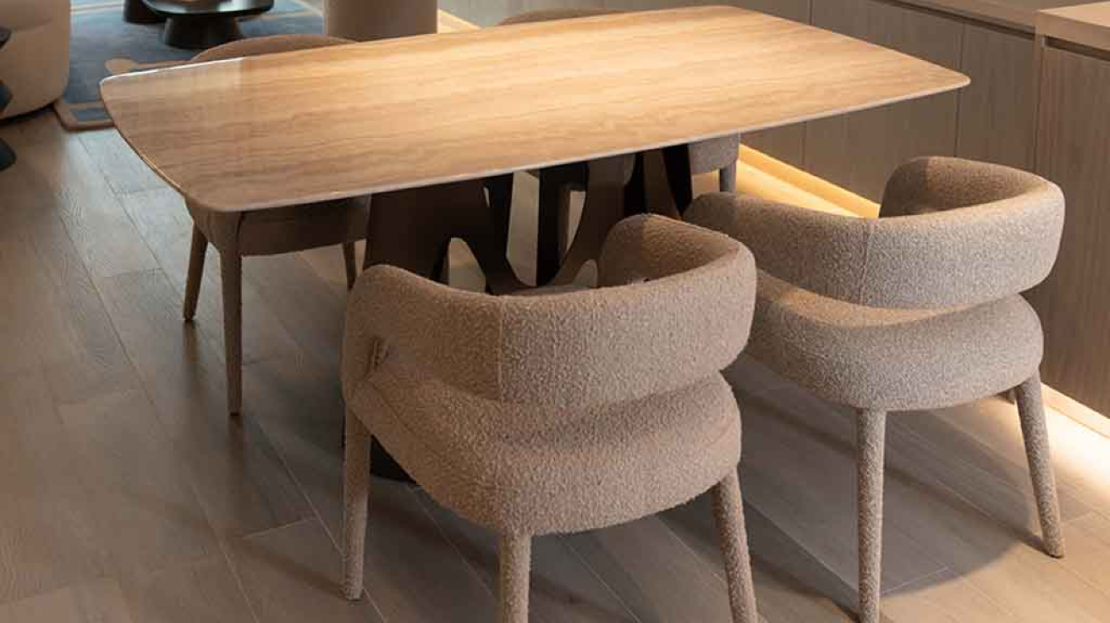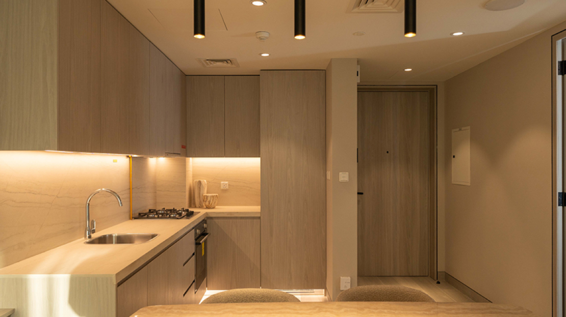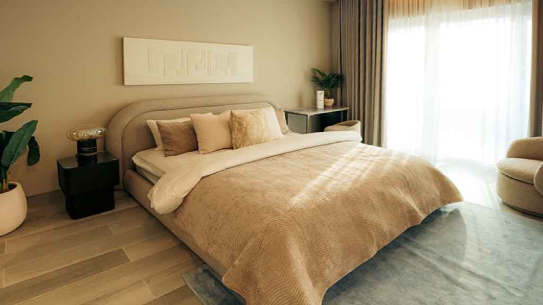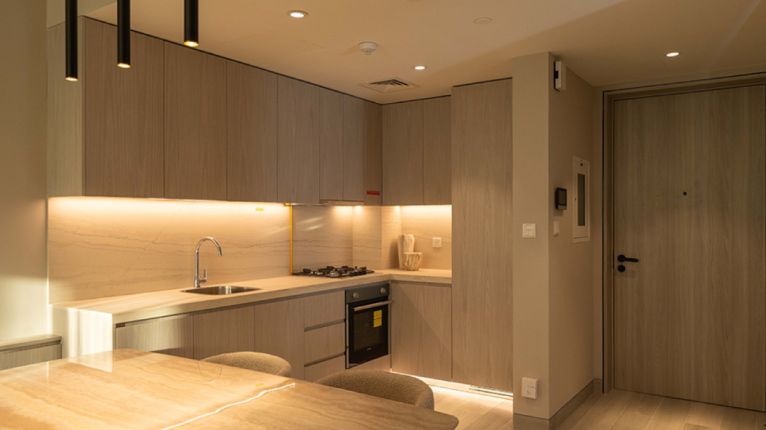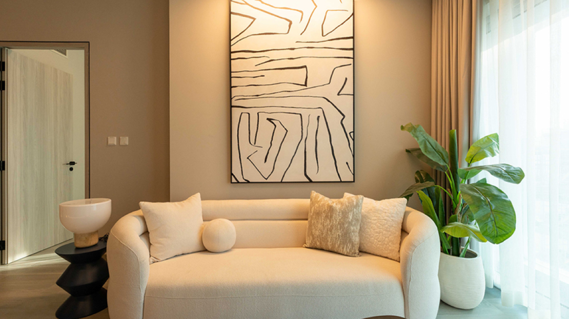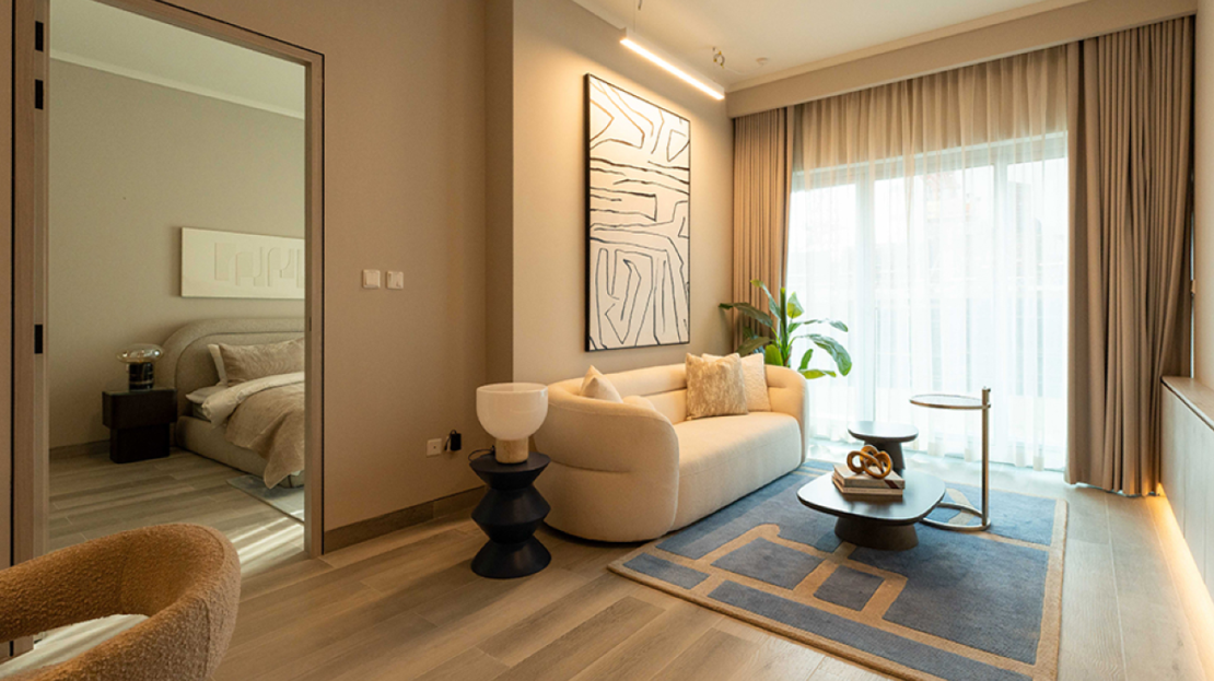 Step inside and be greeted by a light-filled open-plan living space, tastefully decorated with neutral tones, soft lighting, and premium furnishings. The living area features a comfortable sofa set, flat-screen TV, coffee table, and elegant decor—making it perfect for relaxing or entertaining guests.