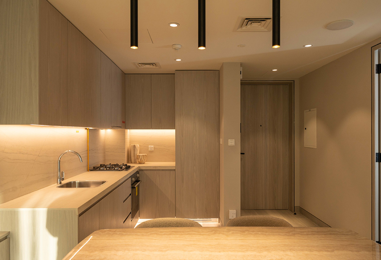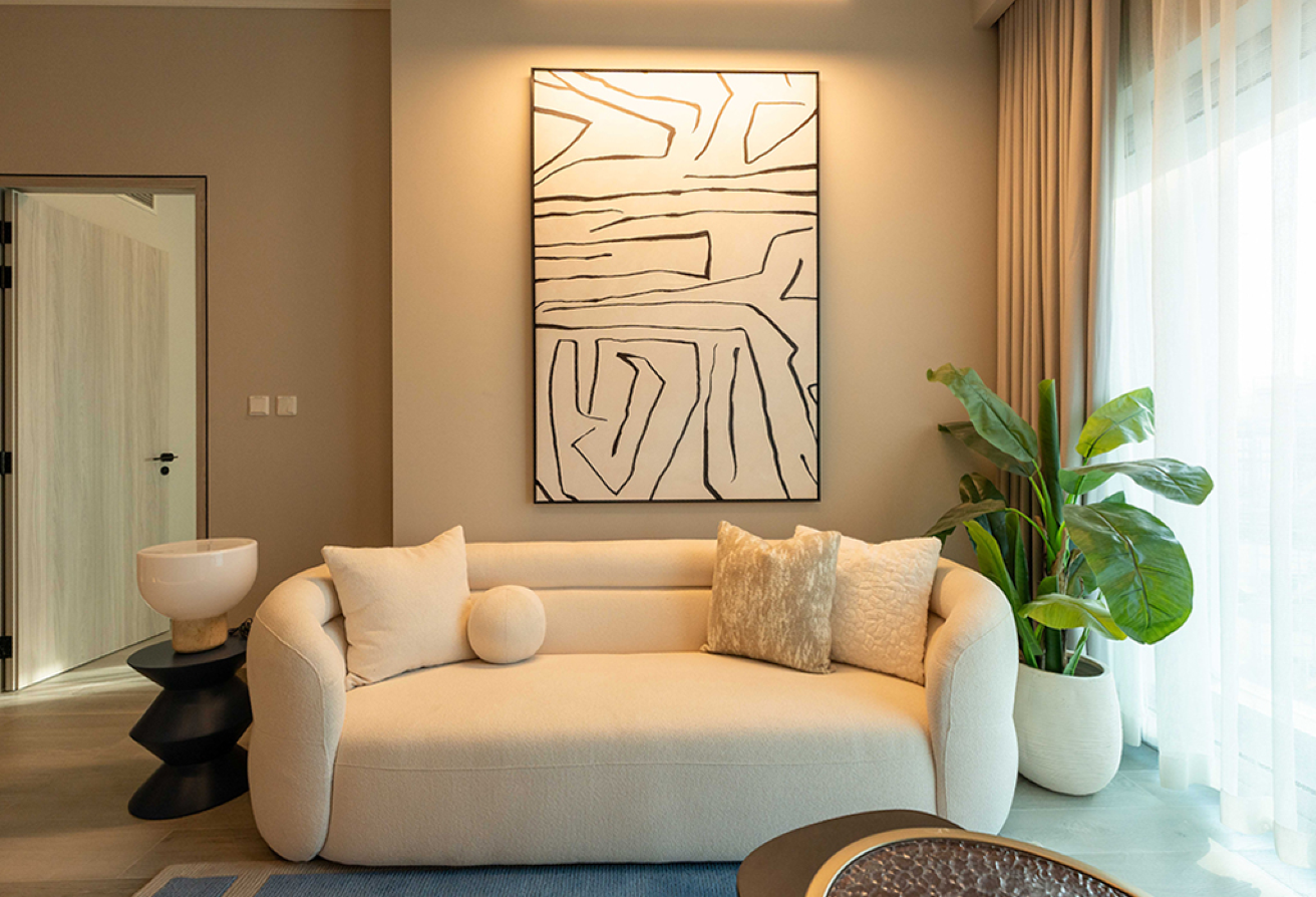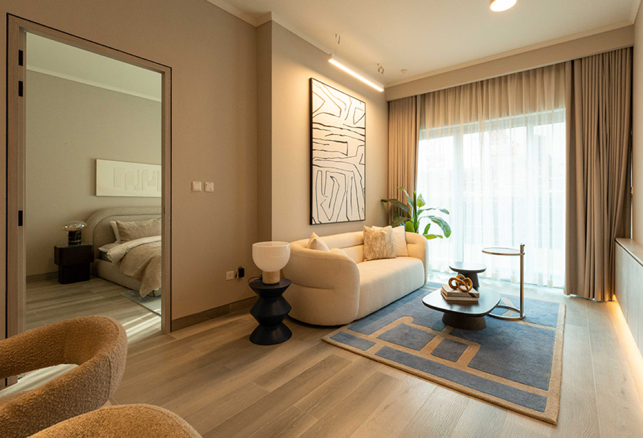 Step inside and be greeted by a light-filled open-plan living space, tastefully decorated with neutral tones, soft lighting, and premium furnishings. The living area features a comfortable sofa set, flat-screen TV, coffee table, and elegant decor—making it perfect for relaxing or entertaining guests.