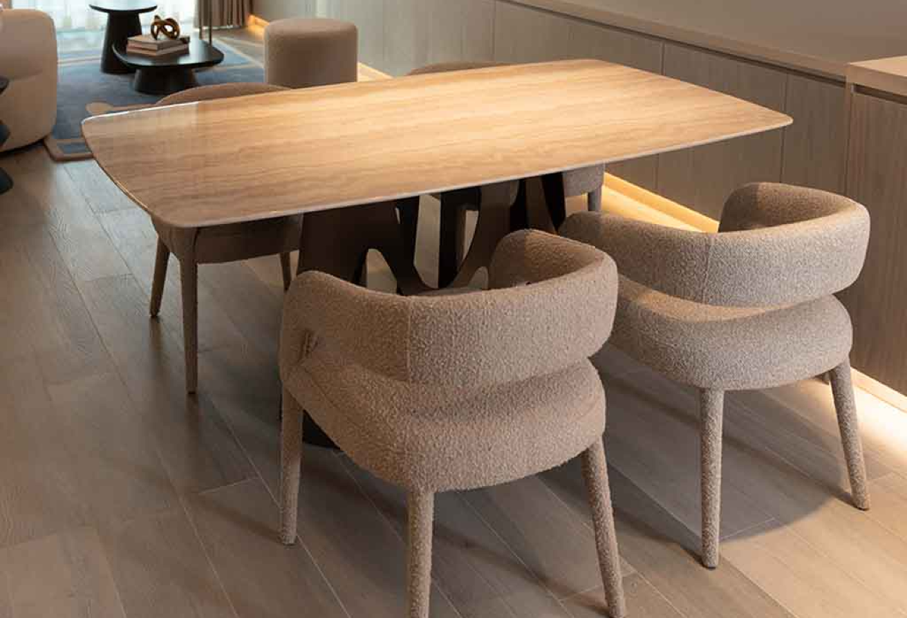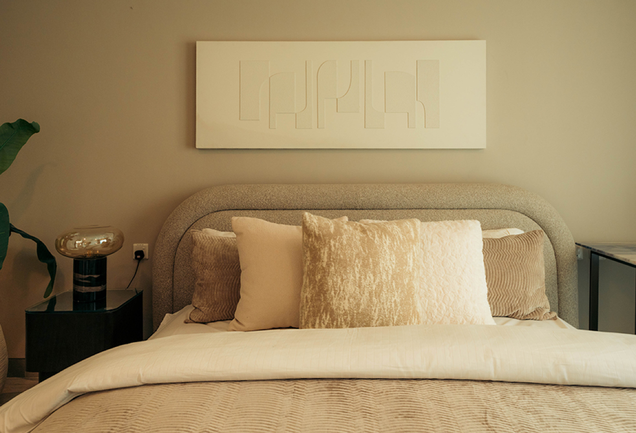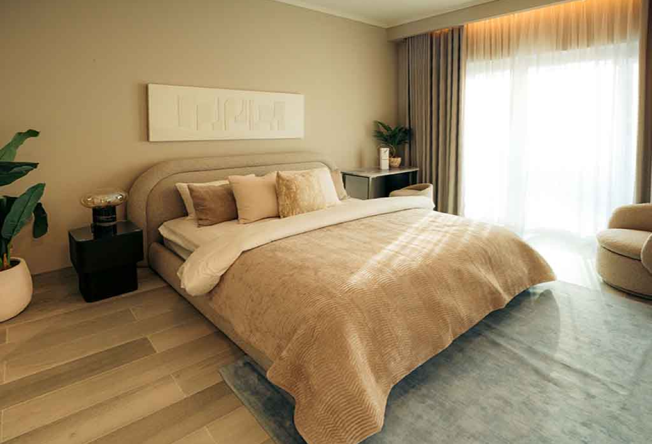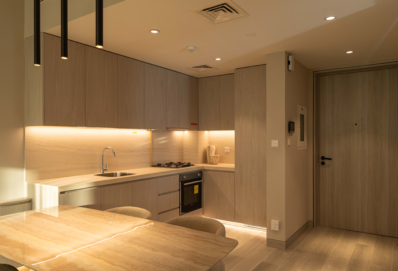 Step inside and be greeted by a light-filled open-plan living space, tastefully decorated with neutral tones, soft lighting, and premium furnishings. The living area features a comfortable sofa set, flat-screen TV, coffee table, and elegant decor—making it perfect for relaxing or entertaining guests.