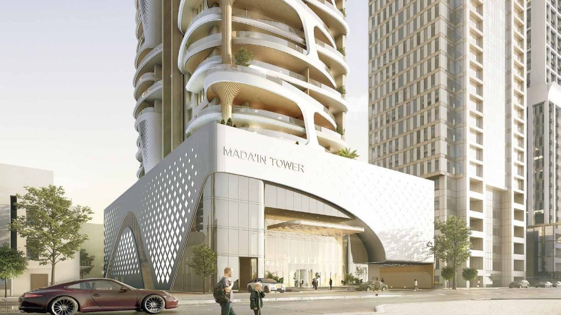 The architecture and interiors of Mada’in Tower apartments reflect a blend of modern design with functional elegance. The apartments for sale in Mada’in Tower are equipped with smart systems, enhancing the living experience for residents. The inclusion of kitchen appliances adds to the convenience, making these apartments ready for immediate occupancy.