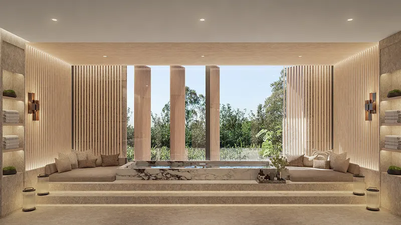 From the moment you enter, a sense of grandeur and serenity envelops you. The meticulously landscaped surroundings, dotted with flowing waterways and verdant green spaces, create an environment that exudes peace and relaxation. The Biophilic design principles incorporated into each mansion foster a seamless connection between indoor and outdoor spaces, promoting a harmonious living experience.
