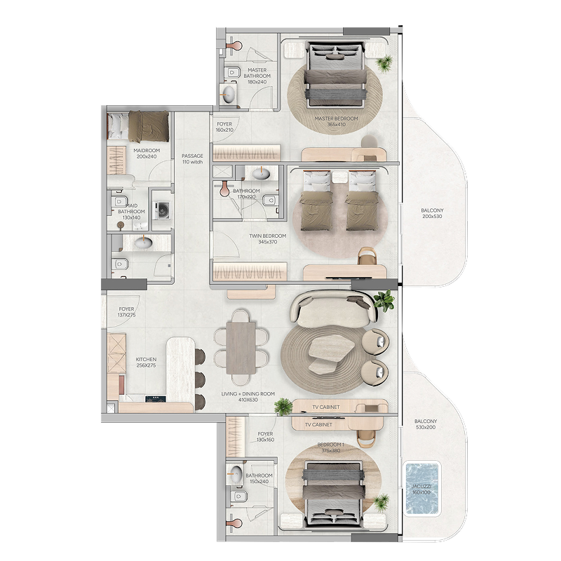 The residences include one-, two-, and three-bedroom apartments, as well as four-bedroom townhouses and penthouses. Each home is fully furnished, thoughtfully designed with open layouts, natural textures, and private outdoor spaces such as terraces, balconies, or even jacuzzis. Complementing the residences, Vestoria Bay Club offers a curated lifestyle across multiple levels — from family pools and kids’ play zones to an open-air cinema, rooftop lounge, wellness terrace, and modern fitness hub. Together, they create a vibrant community atmosphere within an elegant coastal retreat.
